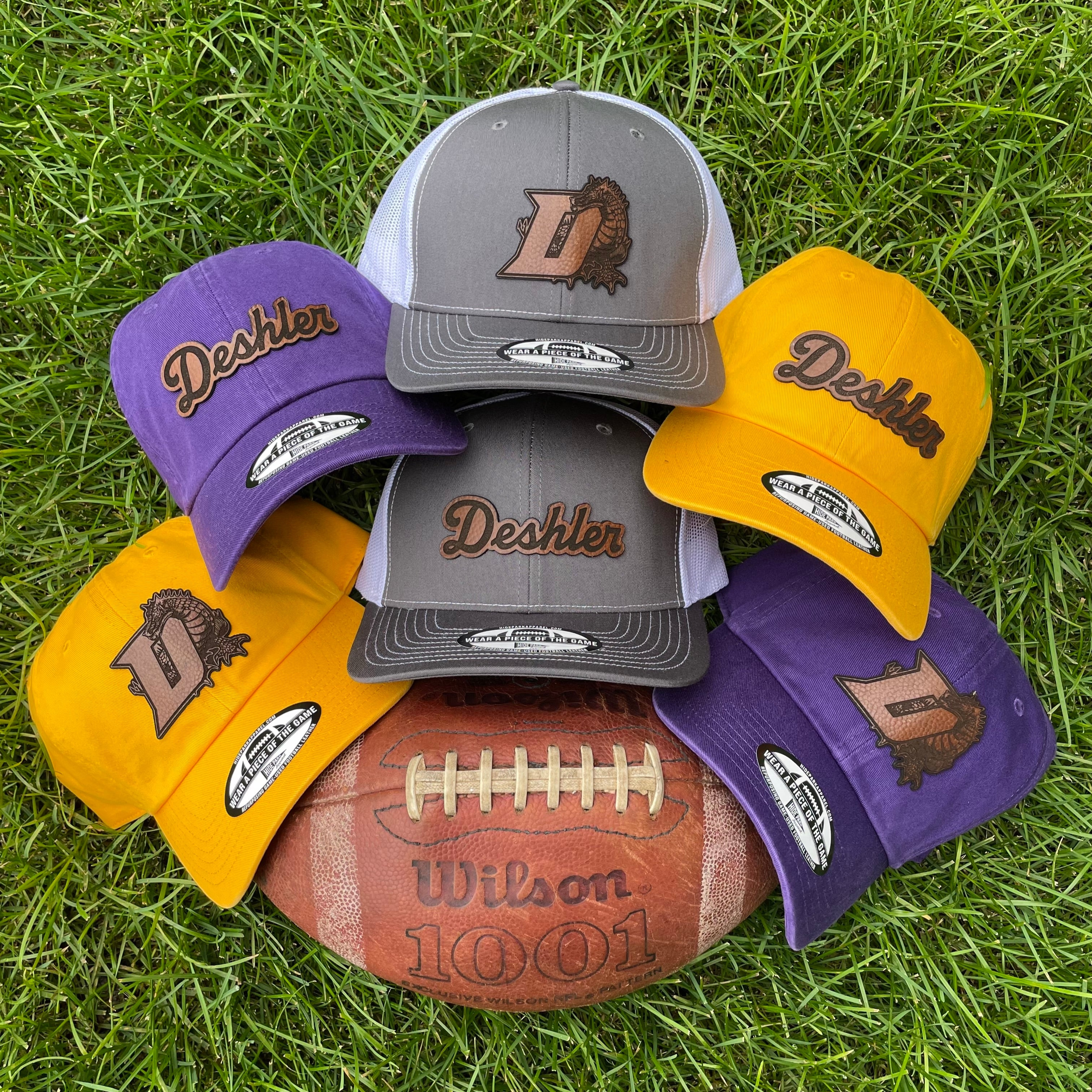 Introducing our exclusive product collection in collaboration with Deshler Public Schools! Discover a remarkable assortment of unique hats, meticulously crafted from repurposed, authentic game-used footballs. By selecting our products, you're also championing Deshler as a portion of the sales will go back to the Dragons program.