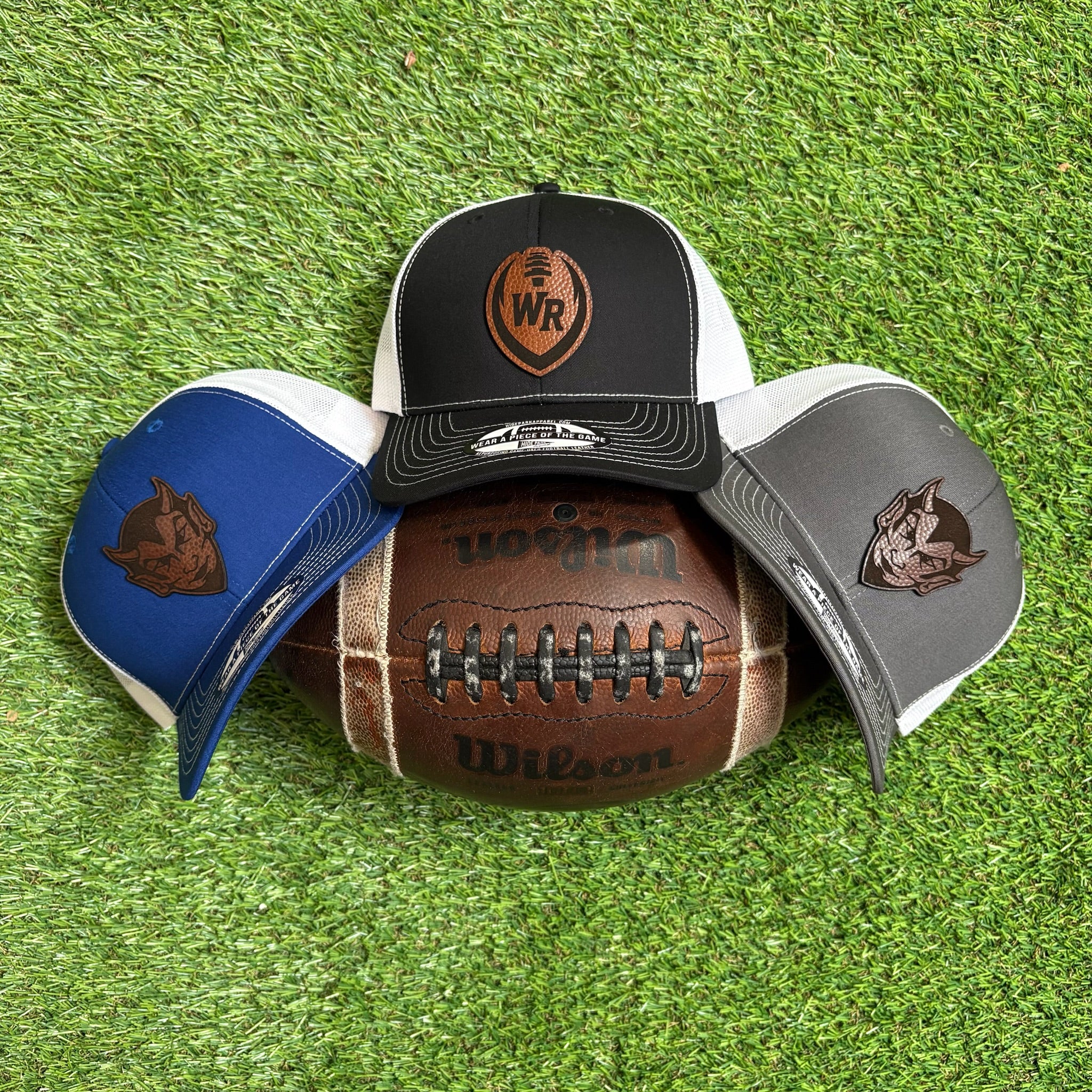 Introducing our exclusive product collection in collaboration with Wood Ridge High School! Discover an assortment of unique hats, meticulously crafted from repurposed, authentic game-used footballs.