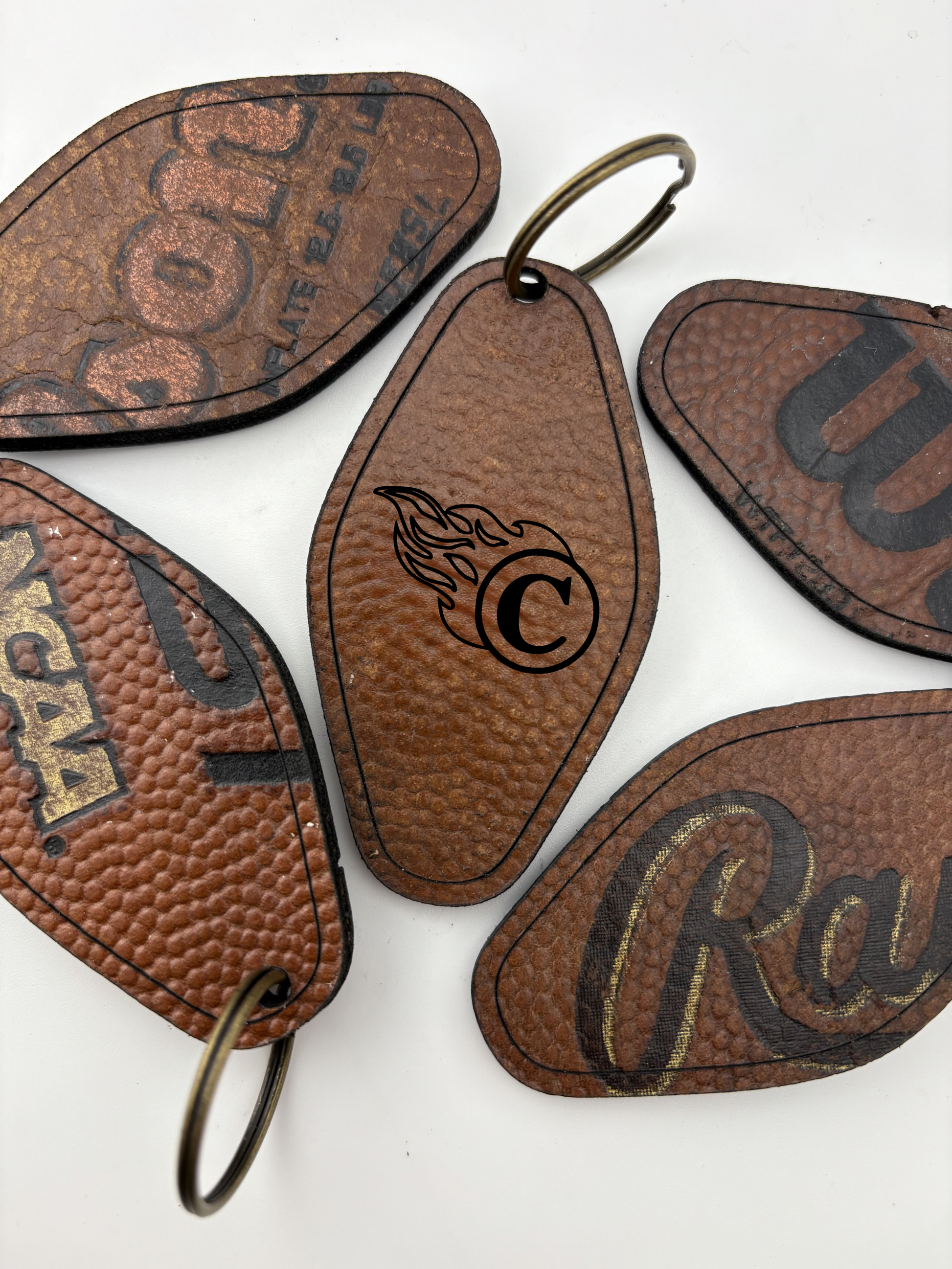 Never leave the house without Comets pride in your pocket! This one-of-a-kind keychain is crafted from authentic, repurposed game-used football leather, giving it a rugged, storied feel that’s as tough as Friday night lights. One side proudly features the Comet Logo while the other showcases a bold imprint of the football’s original texture—marks of the game that remind you where you've been and what you represent.